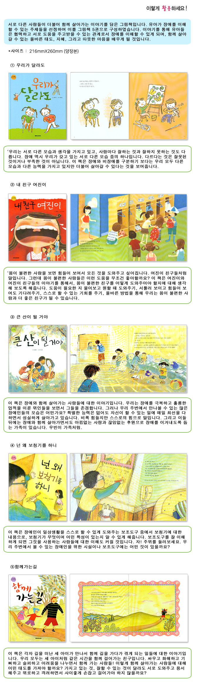 책을 통해서 서로 도움을 주고 받을 수 있는 협력의 관계로서 장애를 이해하고, 함께 살아갈 수 있는 올바른 태도, 지혜 그리고 따뜻한 마음을 배울 수 있습니다.