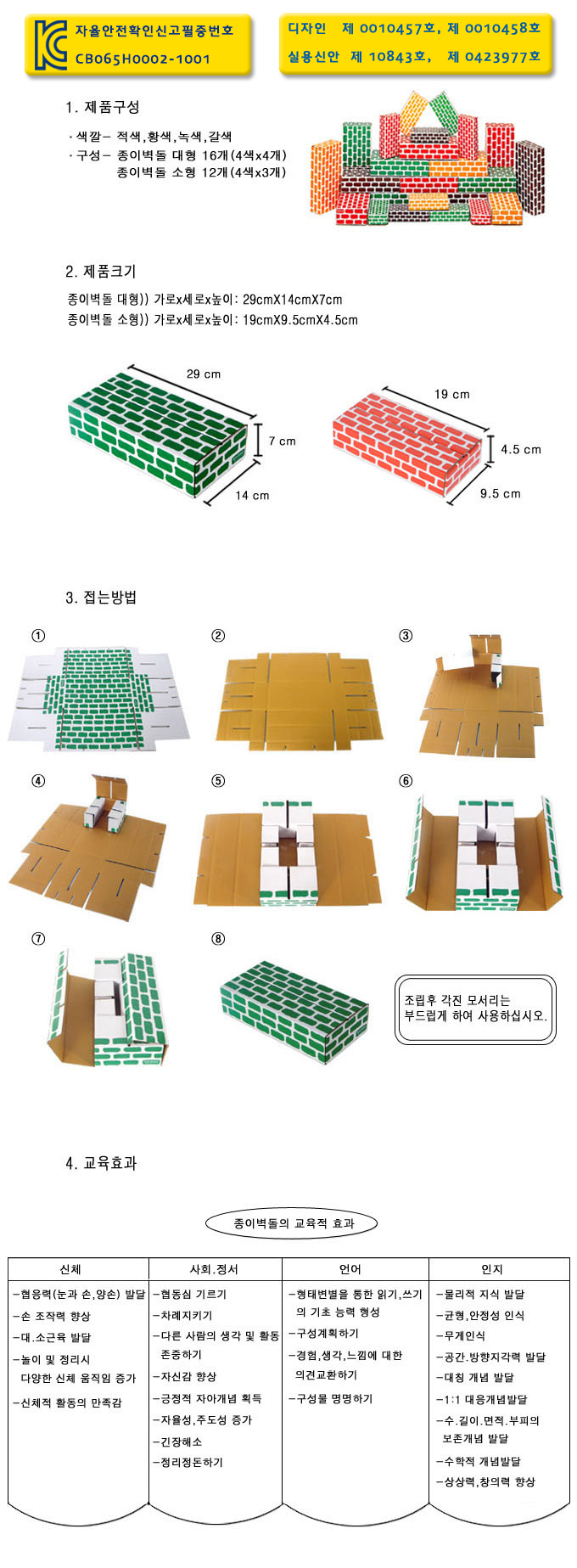 개인적으로 결혼 전에 어린이집 교사로 3년간 근무를 한 경력이 있는 엄마랍니다.^^ 어린이집이나 유치원의 쌓기영역에 기본적으로 들어가있는 블럭이 바로 종이벽돌이랍니다. 교사로 근무할 당시 아이들이 매일같이 수시로 종이벽돌로 여러가지 것들을 만들며 참 재미나게 잘 갖고 놀았답니다. 그런 모습들을 기억하고 있다보니 저희 딸아이도 꼭 어릴적부터 갖고 놀 수 있도록 해야겠단 생각이 들더라고요. 그래서 종이벽돌 복합세트를 마련해주었는데, 아이가 무척이나 좋아하고 잘 갖고 논답니다.^0^;; 종이벽돌이 워낙 튼튼하고 가벼워서 어린 아이들부터 큰 아이들까지 사용하기에 좋고, 종이벽돌 전체적으로 코팅이 되어있어 걸레로 쓱쓱~ 문질러 닦아도 아무 문제가 없어 너무 좋아요. 종이벽돌의 가장 큰 매력은 쌓고 부수는 과정속에서 아이들의 소근육이 발달되고, 더불어 눈과 손의 협응력발달이나 창의성발달에까지 많은 영향을 준다는 점이예요. 그리고 종이벽돌로 높이 쌓은 구조물을 무너뜨리면서 스트레스도 풀 수 있어 아이들의 정서발달에도 많은 도움이 된다고 생각합니다. 저희 딸아이의 경우 종이벽돌을 길게 늘어뜨려 놓은 다음 징검다리 건너기놀이를 매우 즐겨하고, 집을 만든 다음 그 속에 들어가 노는 것을 무척이나 좋아한답니다.^^ 병원놀이를 할 땐 큰 종이벽돌을 이어붙여 침대를 만든다음 진료대로 사용하기도 한답니다. 또 소꿉놀이를 할 땐 식탁도 만들고 의자도 만든다음 여러가지 음식을 차려놓고 먹으며 놀기도 하고, 커피나 차를 배달하는 놀이도 하면서 아주 재미있게 논답니다.^^ 요즘에는 저희 딸이 가게놀이하는 것을 무척 좋아하는데, 종이벽돌을 높게 쌓고는 얼굴이 보일만큼의 창문을 만들고는(매점처럼) 그 안에 들어가 여러가지 물건들을 진열해놓고 판매하는 놀이를 자주 한답니다. 저희 딸은 가게주인이 되고, 저는 손님이 되어 사고 파는 놀이를 하면서 노는데, 아이가 오랫동안 집중하며 무척 재미나게 놀더라고요.^^ 동물원에 다녀온 다음날엔 종이벽돌로 동물들의 우리를 만들고는 그 안에 동물모형이나 동물인형을 넣어 동물원 만들기 놀이를 해도 재미있답니다. 먹이도 주고 아픈 동물들이 있으면 수의사가 되어 치료도 해주면서 말이지요. 또 목욕탕처럼 만들고는 그 안에 들어가 목욕도 하고 머리도 감으며 놀아도 재미있고요. 어떤 형태로 만드냐에 따라 자동차가 되기도 하고, 기차가 되기도 하고, 오토바이도 되는 등... 아이의 관심이나 흥미에 따라 여러가지 방법으로 다양하게 접근해 놀이하기에 너무 좋은 놀잇감이랍니다. 그래서 아이 키우는 여러 엄마들께 강력추천해드리고 싶은 상품입니다. 유아 대상의 TV프로를 보다보면 이 종이벽돌을 자주 볼 수가 있는데, 그럴때마다 저희 딸아이가 우리집에 있는 똑같은 종이벽돌이라며 무척이나 반가워하고 좋아한답니다.^^ 벽을 높게 세우고 집을 만들려면 수량이 부족해 아쉽다는 점 이외에 종이벽돌 자체의 단점은 전혀 없이 너무 튼튼하게 잘 만들어진 상품이랍니다. 한가지 바라는 점이 있다면 대형의 경우 조립을 해놓았을 때 들뜨지 않아 좋은데, 소형의 경우 신경써서 조립을 해도 마지막에 맞물려 들어가는 부분이 조금 들뜨더라고요. 접혀 들어가는 부분의 사이즈를 좀 더 늘려 만든다면 아귀가 딱 맞게 평평하게 조립이 될 것 같단 생각이 듭니다. 그 점을 제안드리고싶고, 종이벽돌을 정리해둘 수 있는 정리함을 따로 제작해 판매해주시면 더욱 좋을 것 같습니다. 두꺼운 보드 재질의 상자정리함식으로 만든다면 놀고난 후 깔끔하게 정리되니 좋고, 먼지도 덜 타 좋을 것 같아요. 앞으로도 다양한 방법으로 재미나고 즐겁게 잘 활용하며 갖고놀거예요.^^ 좋은 상품 만들어주셔서 감사하고요. 대형이나 소형 모두 필요시에 따라 따로 구매할 수 있게 해주시면 더욱 좋을 것 같아요.(풀세트가 아닌 10개, 20개식의 소량 판매식으로요.^^)